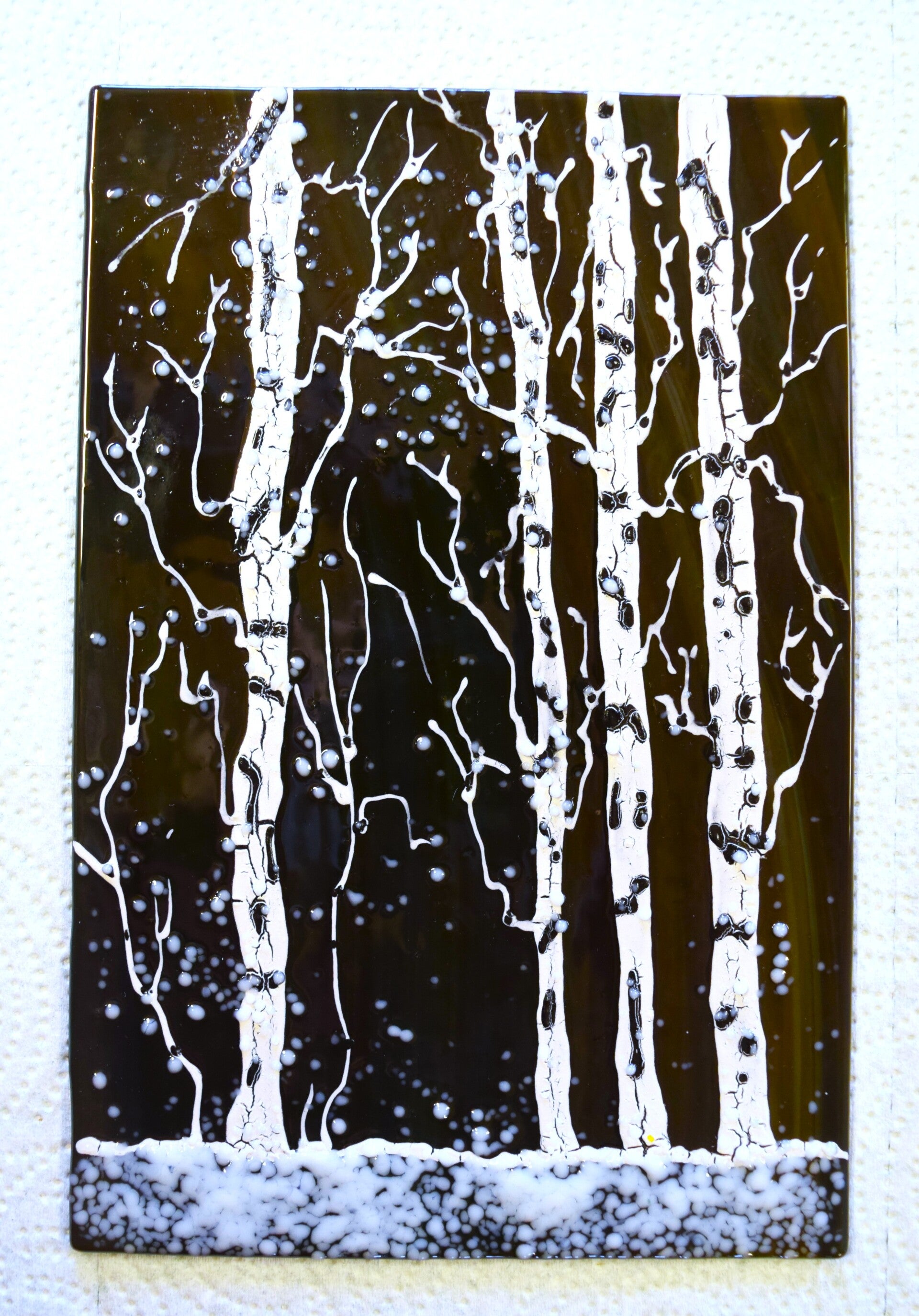 This a an opaque panel in a wood stand. Dark colors highlight the Aspens in this wonderful winter scene. 5.5"x10"