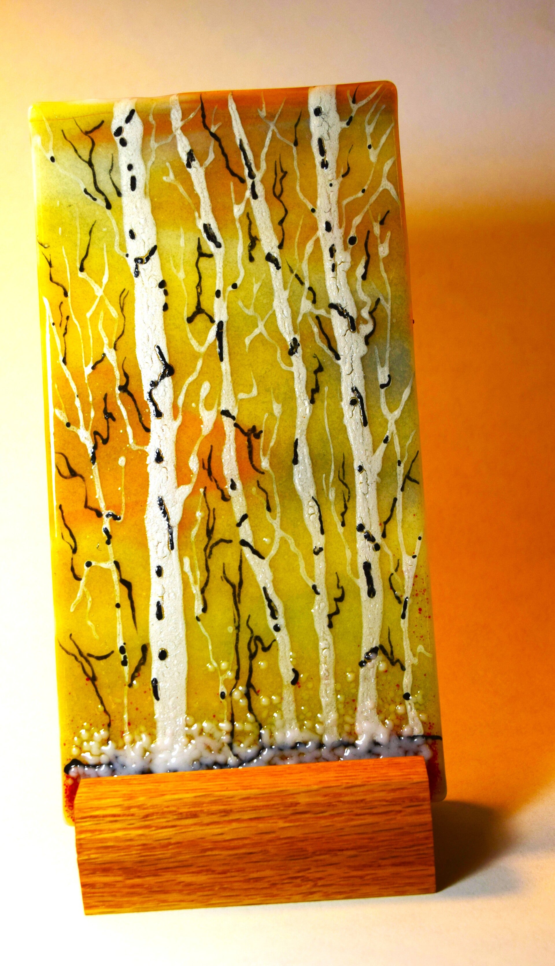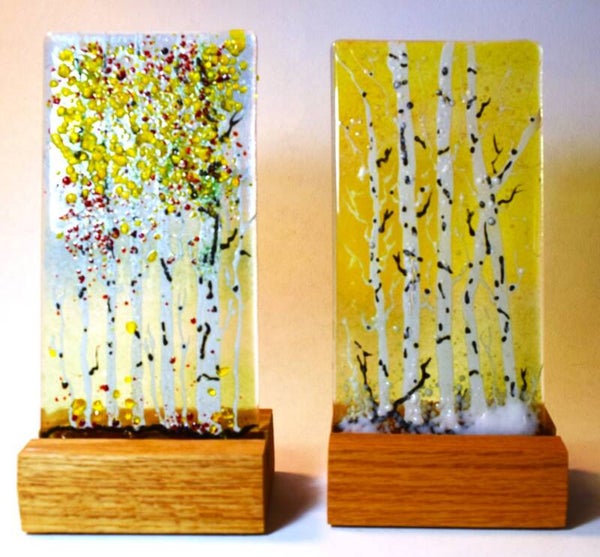 This a an bright transparent panel in a wood stand. Fall colors highlight the Aspens in this wonderful scene. 5.5"x10"