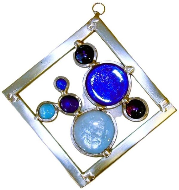 These Squares are a fun version of a stained glass panel. Three sizes available. 8 & 6" contain Brazilian Agate. The 4" is glass and gems only. Fun unusual pieces.